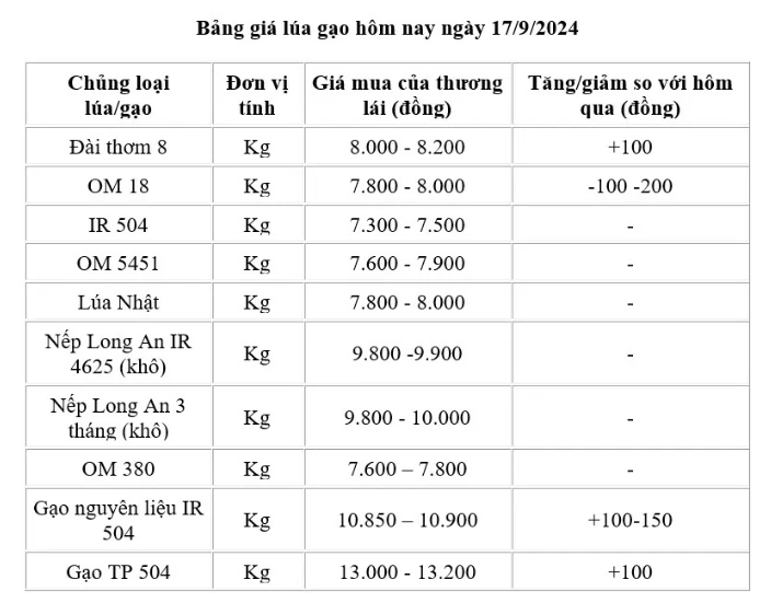 Giá lúa gạo hôm nay ngày 17/9 tại khu vực Đồng bằng sông Cửu Long tăng từ 100 – 150 đồng/kg với gạo nguyên liệu và thành phẩm. Giá lúa biến động trái chiều từ 100 – 200 đồng/kg.