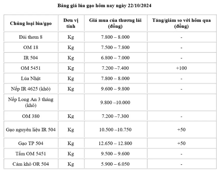 Cập nhật từ Sở Nông nghiệp và Phát triển nông thôn tỉnh An Giang cho biết, giá lúa hôm nay ghi nhận có điều chỉnh so với ngày hôm qua, IR 50404 giá ở mức 6.800 – 7.000 đồng/kg; Lúa Đài thơm 8 ở mức giá 7.800 – 8.000 đồng/kg, Lúa OM 5451 ở mức 7.200 – 7.400 đồng/kg, tăng 100 đồng/kg; Lúa OM 18 có giá 7.500 – 7.800 đồng/kg; OM 380 dao động 7.200 – 7.300 đồng/kg; Lúa Nhật ở mốc 7.800 – 8.000 đồng/kg và lúa Nàng Nhen (khô) ở mức 20.000 đồng/kg.