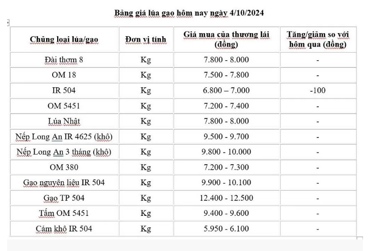 Giá lúa gạo hôm nay 4/10 tại các tỉnh Đồng bằng sông Cửu Long giảm với mặt hàng lúa. Giá lúa giảm nhẹ. Giá gạo duy trì ổn định so với ngày hôm qua.