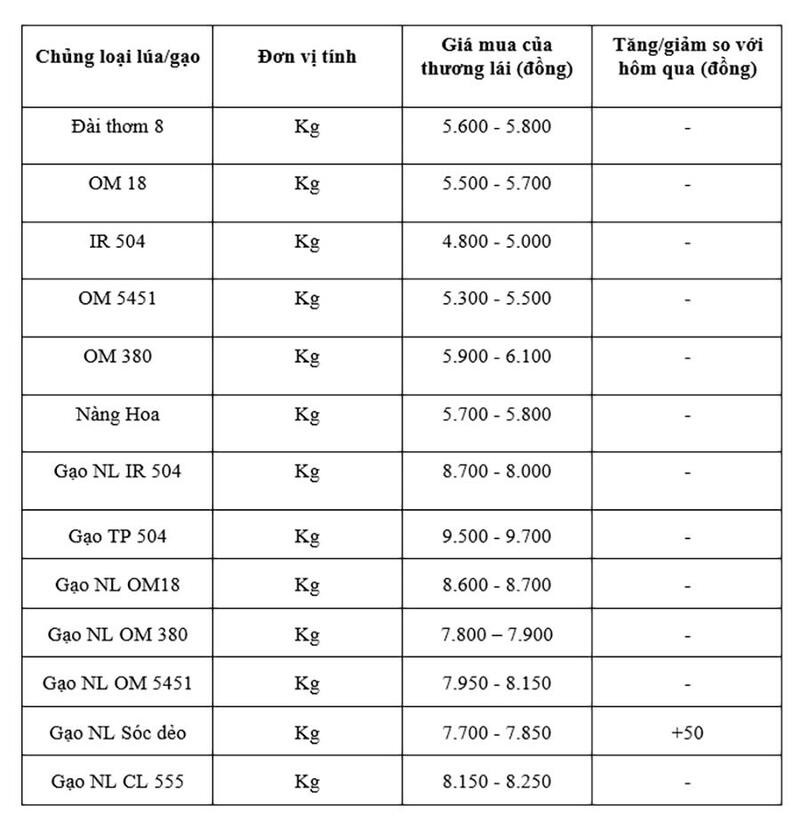 Tương tự với mặt hàng lúa, theo cập nhật từ Sở Nông nghiệp và Môi trường tỉnh An Giang, hiện giá lúa OM 18 (tươi) dao động ở mốc 5.500 – 5.700 đồng/kg; giá lúa IR 50404 (tươi) dao động ở mức 4.800 – 5.000 đồng/kg; giá lúa OM 5451 (tươi) dao động mốc 5.300 – 5.500 đồng/kg; giá lúa Đài Thơm 8 (tươi) dao động ở mốc 5.600 – 5.800 đồng/kg; giá lúa Nàng Hoa 9 dao động ở mức 6.000 – 6.200 đồng/kg; giá lúa tươi OM 308 dao động ở mức 5.700 – 5.900 đồng/kg so với hôm qua.