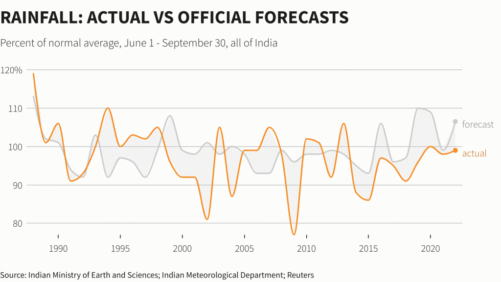 Lượng mưa từ đầu mùa đến nay không đều, với lượng mưa tháng 6 thấp hơn 9% so với mức trung bình nhưng lượng mưa tháng 7 lại cao hơn 13% so với mức trung bình. Thông tin từ IMD cho biết tháng 9 của 4 năm gần đây đều chứng kiến lượng mưa trên mức trung bình do mùa mưa kết thúc chậm. Nhưng năm nay dự kiến sẽ khác.