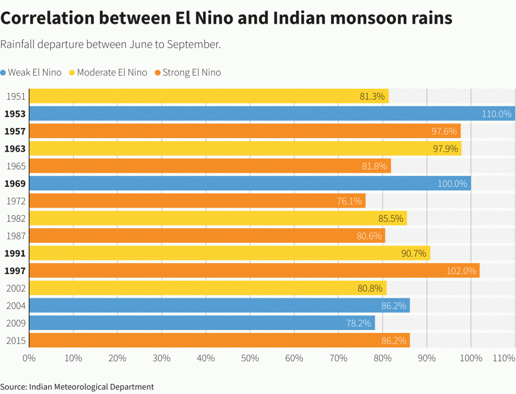 Reuters dẫn lời một quan chức cấp cao của Cục Khí tượng Ấn Độ (IMD) cho biết: “El Niño đã làm giảm lượng mưa trong tháng 8 và cũng sẽ có tác động tiêu cực đến lượng mưa trong tháng 9”. Trong khi đó, mùa mưa ở Ấn Độ (tháng 6 – tháng 9) sắp kết thúc và lượng mưa thiếu hụt ít nhất 8%, sẽ là mức giảm lớn nhất kể từ năm 2015, khi El Niño cũng làm giảm lượng mưa.