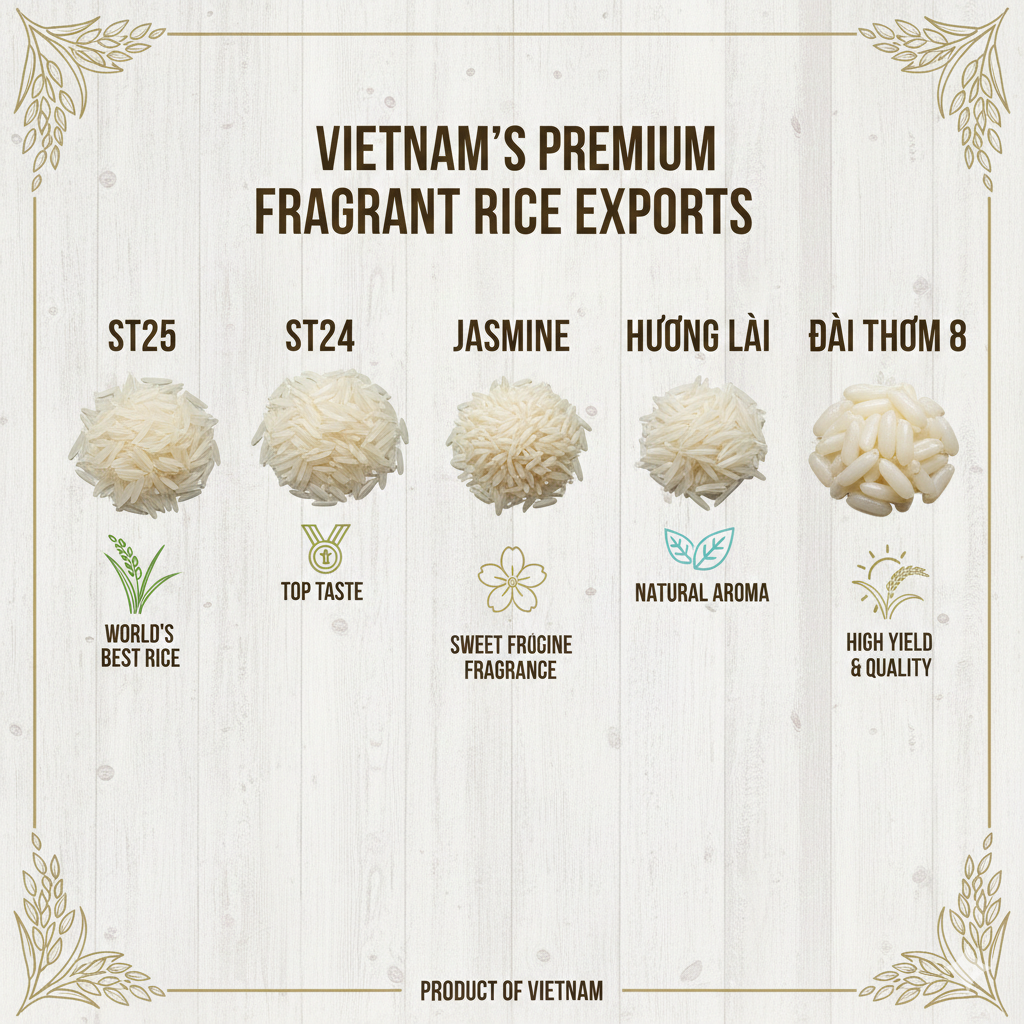 Hiện, các loại gạo xuất khẩu chủ lực của Việt Nam gồm gạo thơm đặc sản (ST25, ST24, Jasmine, Hương Lài, Đài thơm 8), gạo thông dụng (OM 5451, 5451, Japonica, Nàng Hoa, RVT), gạo nếp và gạo tấm.