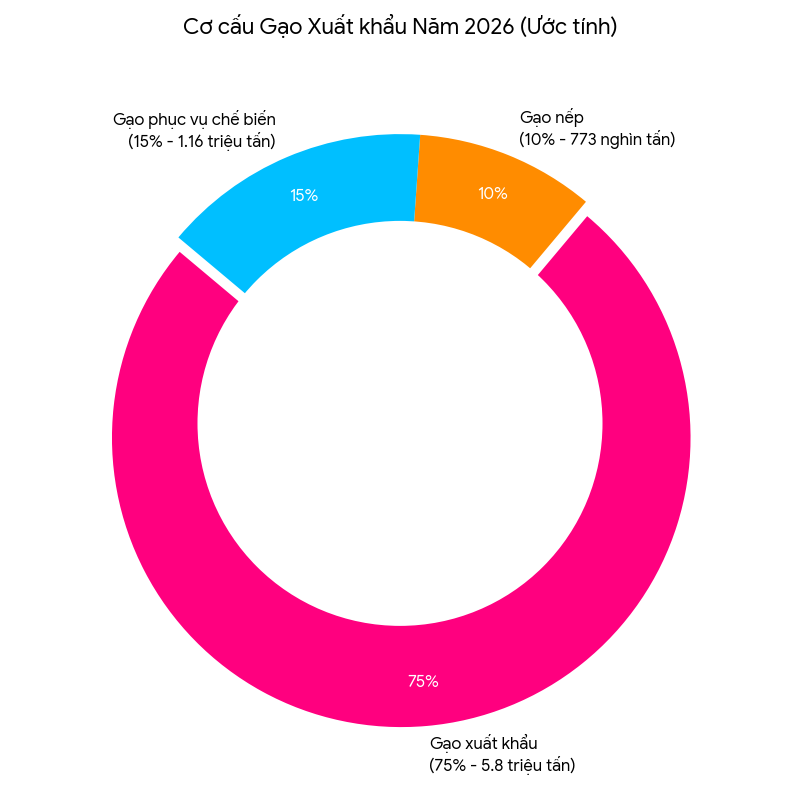 Theo Bộ Nông nghiệp và Môi trường, cơ cấu gạo xuất khẩu năm 2026 sẽ tiếp tục nghiêng mạnh về gạo chất lượng cao và gạo thơm, với sản lượng ước khoảng 5,8 triệu tấn, chiếm tới 75% tổng lượng xuất khẩu. Gạo nếp khoảng 773.000 tấn (10%), phần còn lại là gạo phục vụ chế biến, chiếm khoảng 15%.